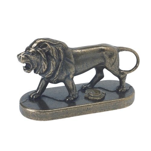 Brushed bronze-finish lion on base with emblem. Approximately 5.08cm x 2.5cm.