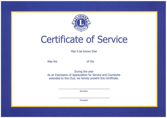 25cm x 20cm certificate with Lions emblem for presentation to retiring Officers, Committee Chairperson and others who have rendered some special service to the Club.