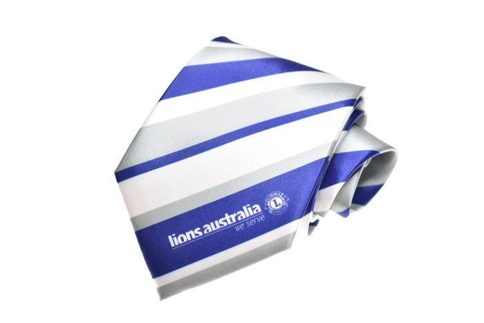 Striped tie in Lions Australia brand colours with logo.