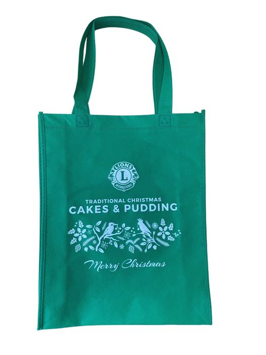 Green enviro bag with Christmas Cake branding, perfect for gift bags. 32cm x 28cm x 7.5cm.