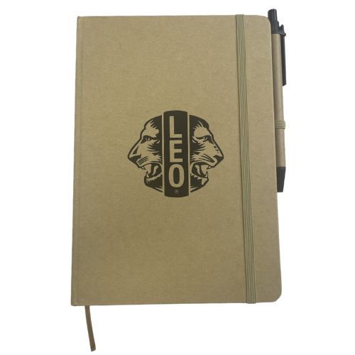 Natural cover A5 notebook with neutral colour elastic strap, pen loop and page marker Includes unbleached cardboard barrel ballpoint pen with plastic push button cap clip & tip Push button action pen Notebook includes 80 leaves, 160 lined white pages