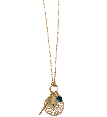 Pendant with filigree flower and dangling charms.
