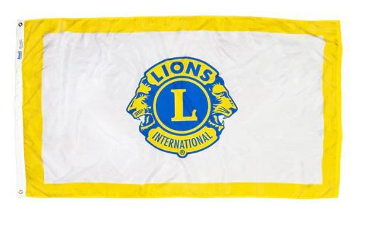 4' x 6' outdoor nylon flag of Lions Clubs International, Lions emblem on a white field with yellow border.