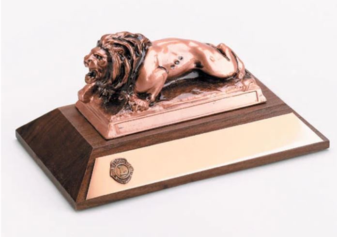 Model lion mounted on polished walnut base. Overall approximate size 12.7 cm x 20cm x 10cm Engraving plate 12.7 cm x 3.17 cm (ENGRAVING NOT INCLUDED)