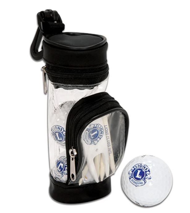 One Clubhouse deluxe set. Set includes: 3 Precept PowerDrive balls, 4 tees, 1 divot tool in golf bag shaped package. LCI emblem imprint on the golf balls. LIONS CLUBS INTERNATIONAL on the tees and divot tool.
